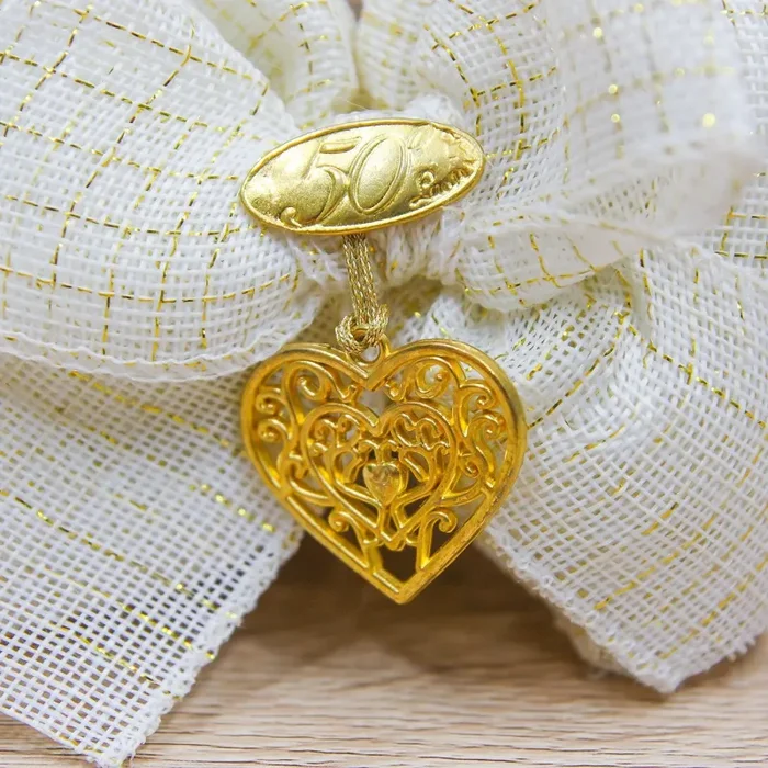 Sacchetto a forma di Fiocco con targhetta 50 e Cuore traforato color oro.