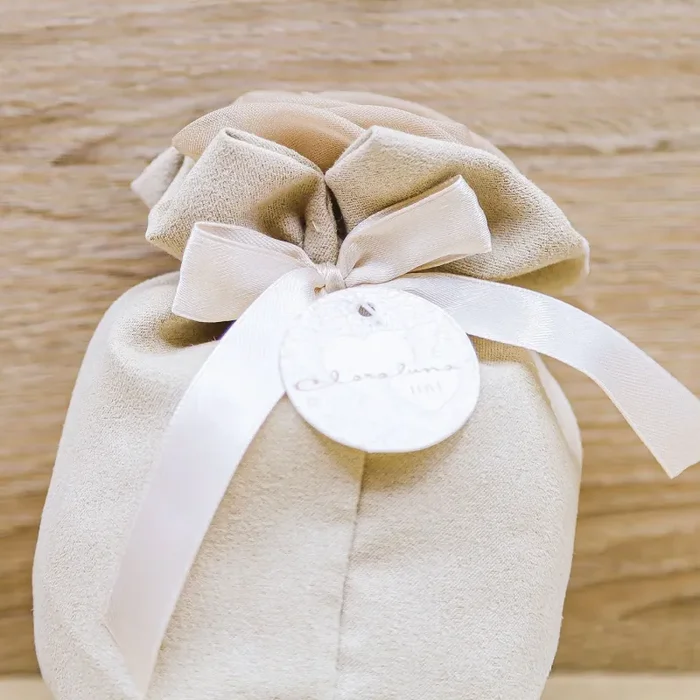 Sacchetto Tortora Grande in Velluto con aggiunta di una rosa in tulle, fiocco in raso tortora e applicazione di una targhetta tonda con decori, scritta “Love”, firmato Claraluna.