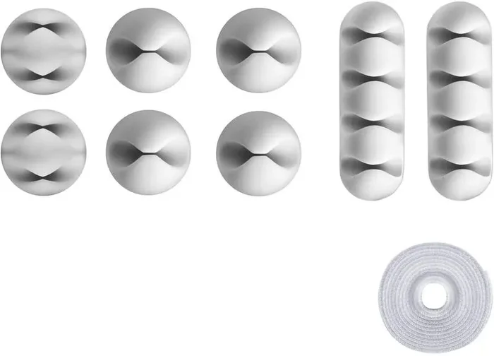 - Viene fornito con 8 fermacavo bianco di diverse dimensioni, più dimensioni per tutti i membri della famiglia; più un nastro di fissaggio per l’organizzazione dei cavi.