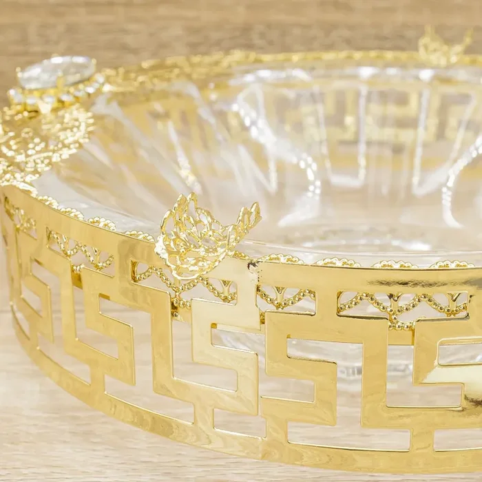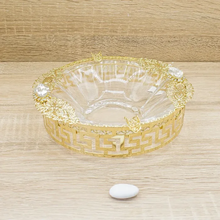 Svuotatasche Tondo in Vetro, con applicazioni floreali e geometriche in metallo bagnato Oro Zecchino 24k e strass