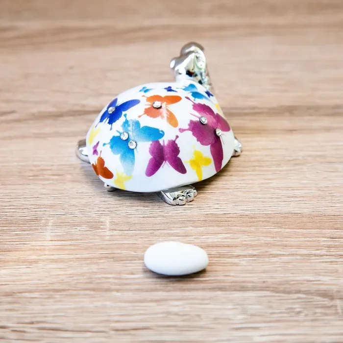 Tartaruga Bilaminato Argento con guscio in vetro decorato con Farfalle colorate e strass, firmato Lully Argenti.