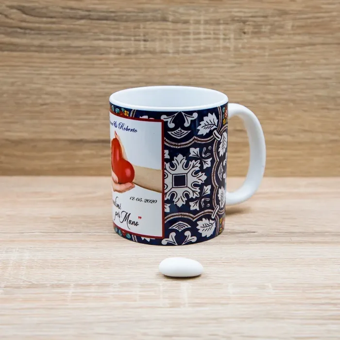 Bomboniera Utile, Tazza in ceramica con nomi e data personalizzate, firmato “Prendimi per Mano”.