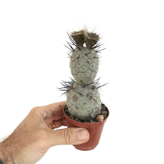 Tephrocactus geometricus SPINE NERE è un cactus unico e affascinante noto per i suoi segmenti geometrici e sferici. Ogni segmento è globulare, tipicamente verde-azzurro, e può raggiungere i 5 cm di diametro. I segmenti hanno una superficie liscia e sono adornati con piccole areole sparse che possono produrre minuscole spine o glochidi. Questo cactus cresce in forma cespugliosa, creando un aspetto scultoreo intrigante. Durante la primavera, produce bellissimi fiori da giallo pallido a bianco, aggiungendo valore ornamentale. Tephrocactus geometricus è una pianta resistente, adatta sia alla coltivazione indoor che outdoor in condizioni xeriche.