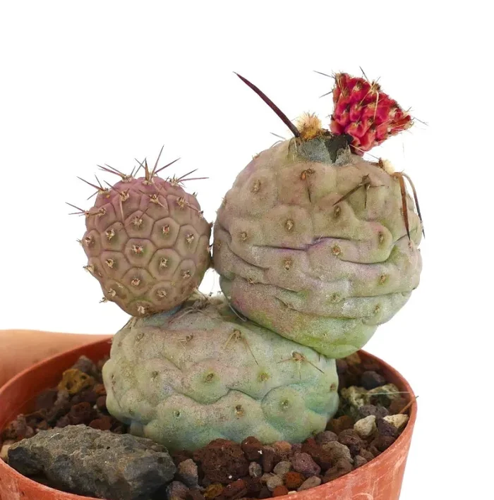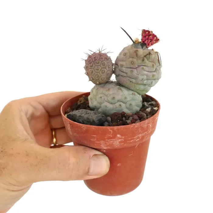 Tephrocactus geometricus SPINE MARRONI è un cactus unico e affascinante noto per i suoi segmenti geometrici e sferici. Ogni segmento è globulare, tipicamente verde-azzurro, e può raggiungere i 5 cm di diametro. I segmenti hanno una superficie liscia e sono adornati con piccole areole sparse che possono produrre minuscole spine o glochidi. Questo cactus cresce in forma cespugliosa, creando un aspetto scultoreo intrigante. Durante la primavera, produce bellissimi fiori da giallo pallido a bianco, aggiungendo valore ornamentale. Tephrocactus geometricus è una pianta resistente, adatta sia alla coltivazione indoor che outdoor in condizioni xeriche.
