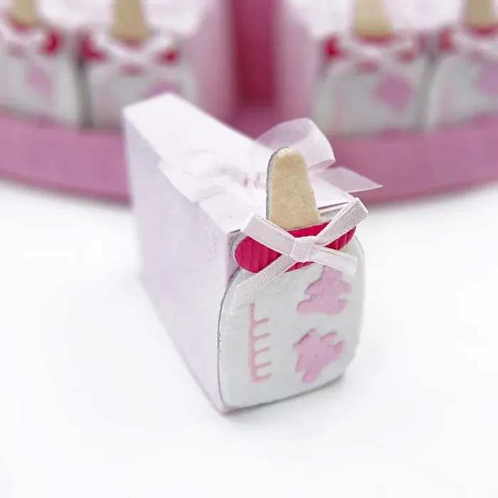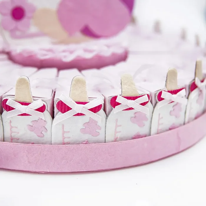 Torta formata da 23 Fette di colore rosa con fiocchetto in organza rosa e applicazione di un biberon Bianco, Fucsia, due Orsetti rosa e fiocco rosa. Al centro della Torta troviamo una bambina dalla tutina rosa e fucsia e cappellino dello stesso colore che ha tra le mani un Biberon grande con la scritta Baby Girl e due fiorellini.