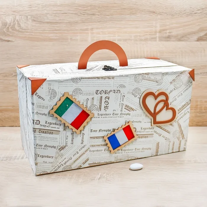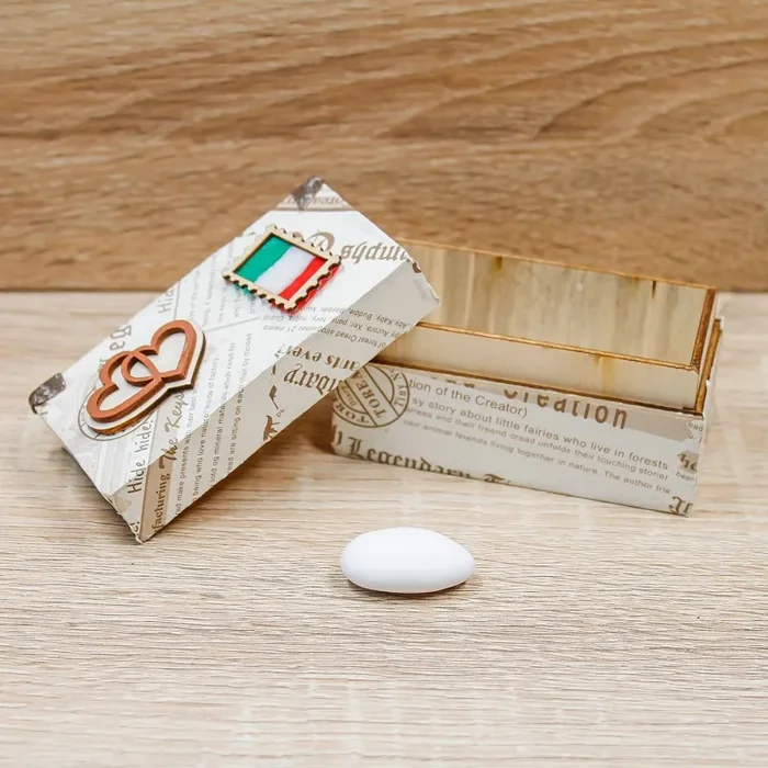 Valigetta in legno con bandiera dell’Italia e due cuoricini in rilievo, firmato DUELLE