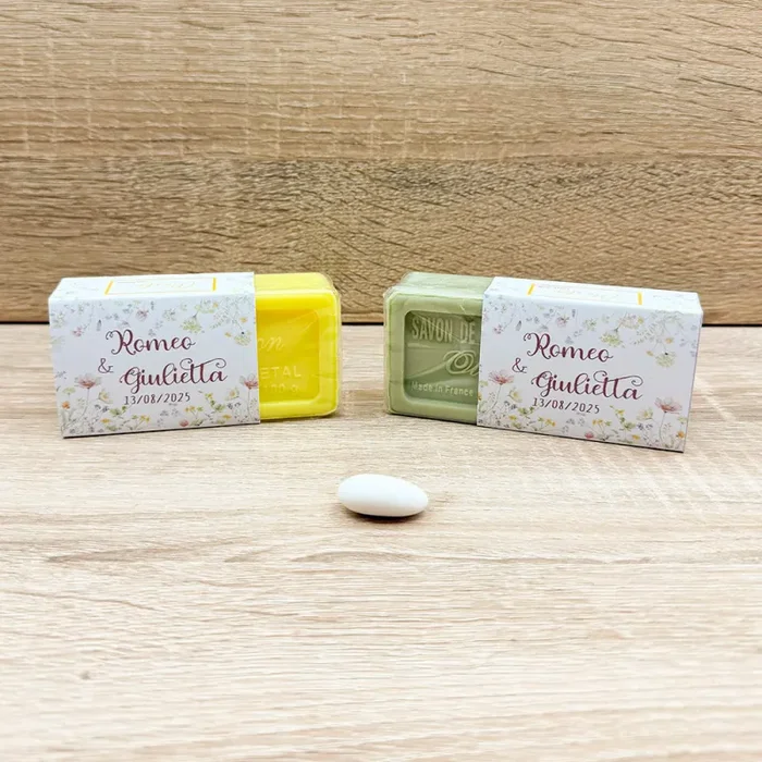 Il prezzo con la confezione comprende: Scatola,Vassoio, 2 Saponi con Fascetta Personalizzabile, 7 Confetti con Pirottini, Nastro e Shopper.