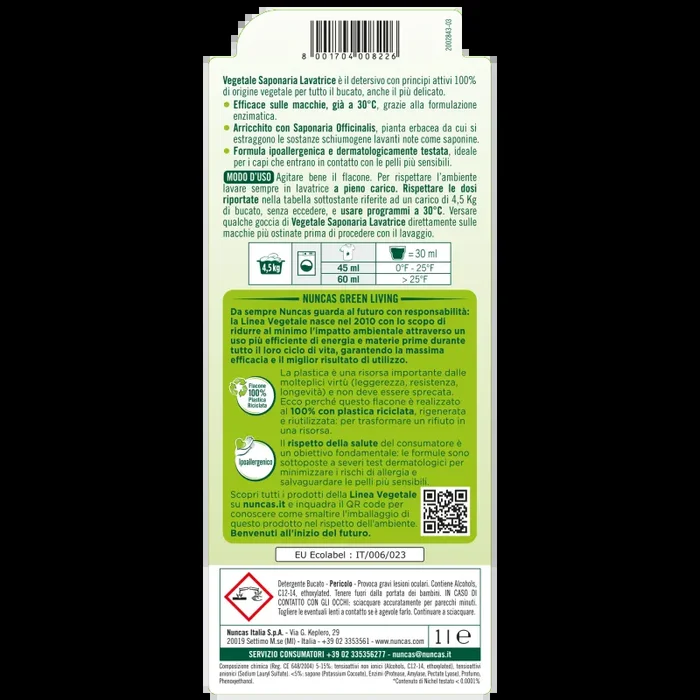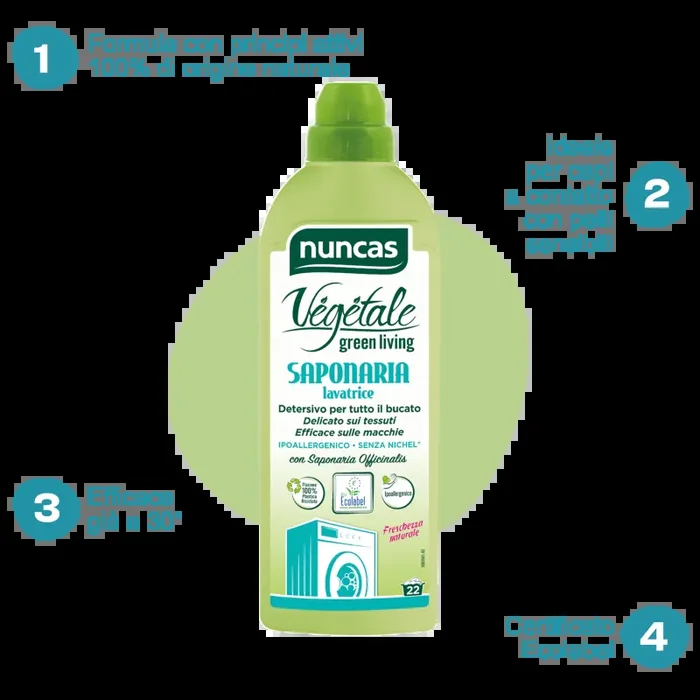 Vegetale Saponaria Lavatrice è il detersivo con principi attivi 100% di origine vegetale per tutto il bucato, anche il più delicato. Efficace sulle macchie già a 30°C, grazie alla formulazione enzimatica. Arricchito con Saponaria Officialis. Formula Ipoallergenica e dermatologicamente testata, ideale per i capi che entrano in contatto con le pelli più sensibili.