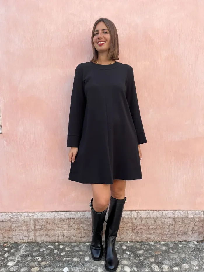 Questo vestito tubino svasato è la scelta perfetta per un look elegante e raffinato. Realizzato con un punto di stoffa di alta qualità, presenta tasche sottili sui lati che donano un tocco di praticità e originalità. Perfetto per ogni occasione, dal lavoro all’aperitivo con amici.